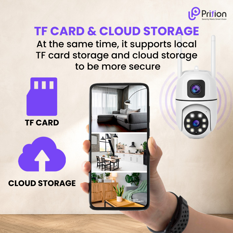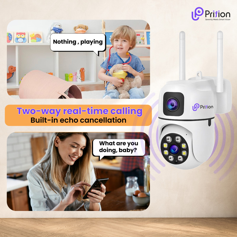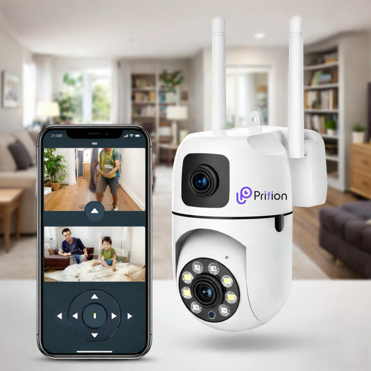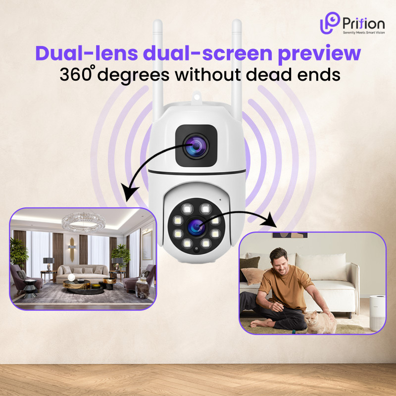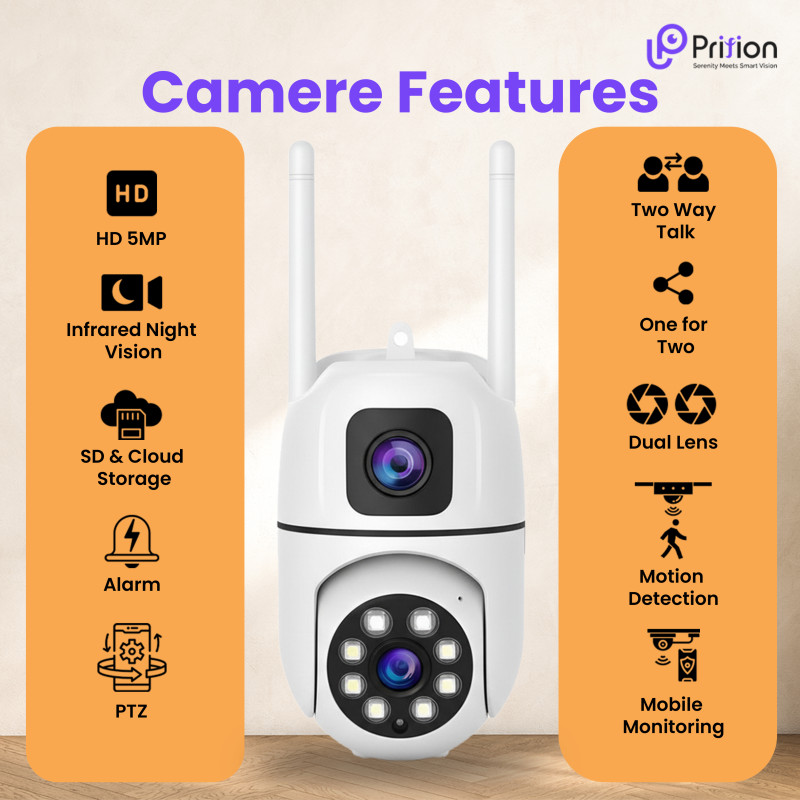 The Prifion Dual Lens Smart WiFi Security Camera is an advanced CCTV camera designed for reliable home and office security. This WiFi camera features dual lens technology for wider coverage and 5MP Full HD video quality for clear monitoring.